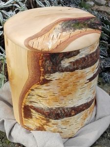 Die Rinde ist im Vergleich zum schlichten hellen Holz kontrastreich und ausdrucksstark, was dieses Stück in seiner wortwörtlichen Vielseitigkeit schön widerspiegelt.